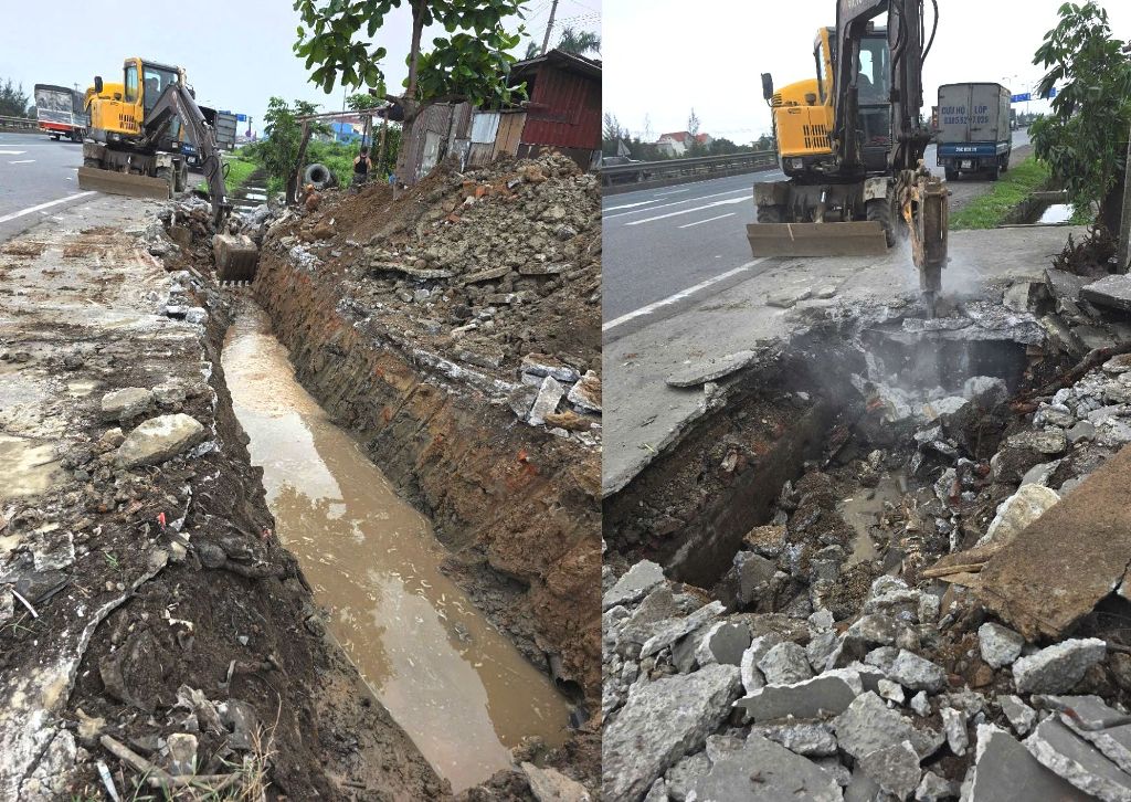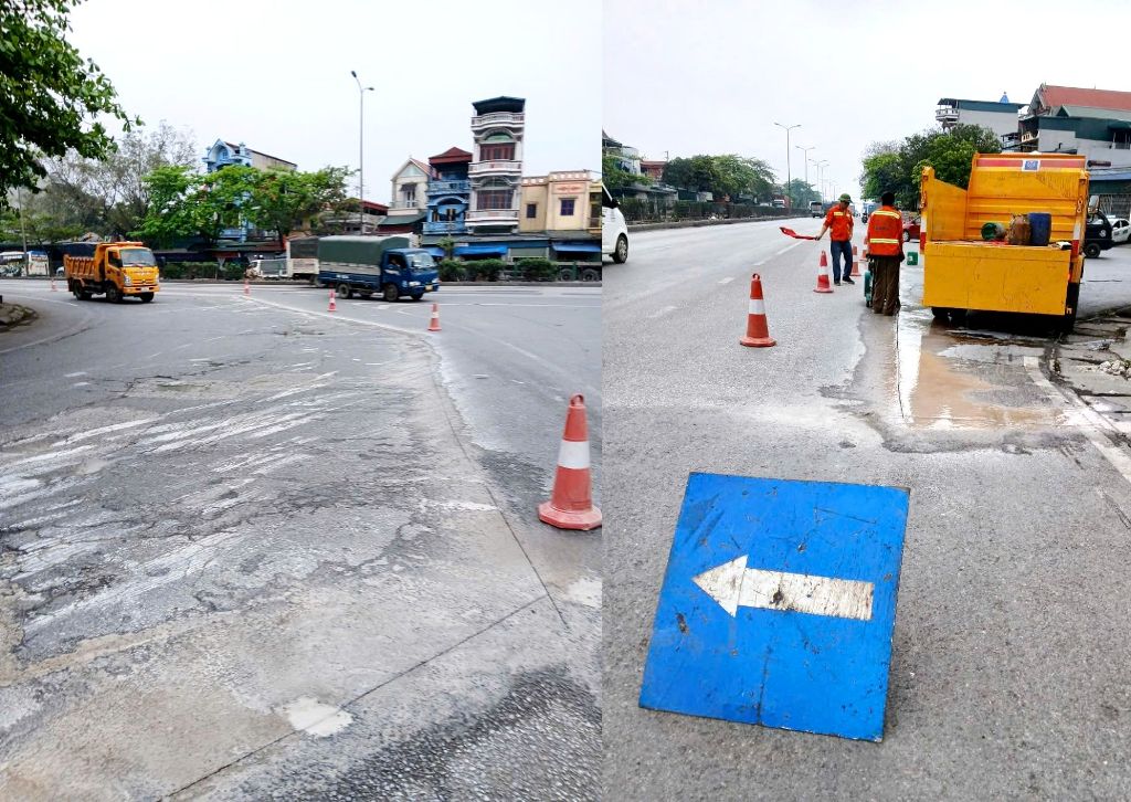 Sửa chữa mặt đường khu vực nút giao Km33+900 (trái tuyến) kịp thời đảm bảo ATGT trong dịp lễ